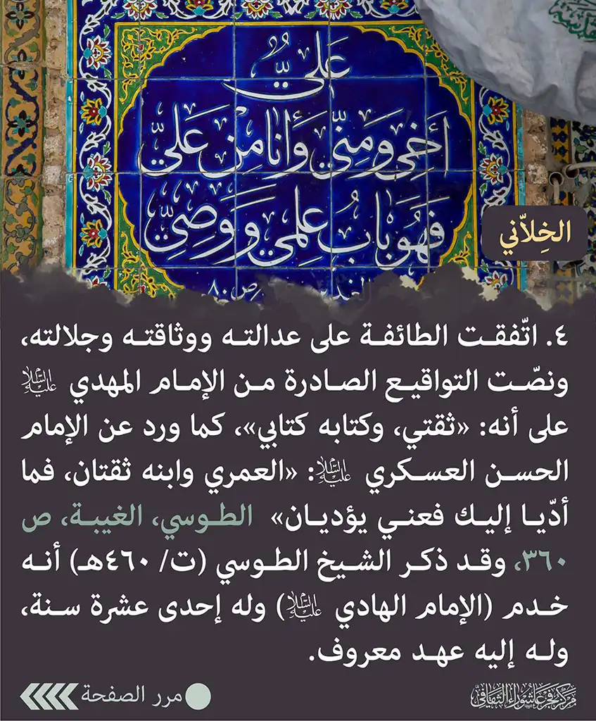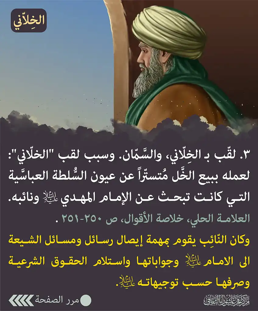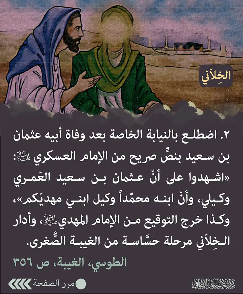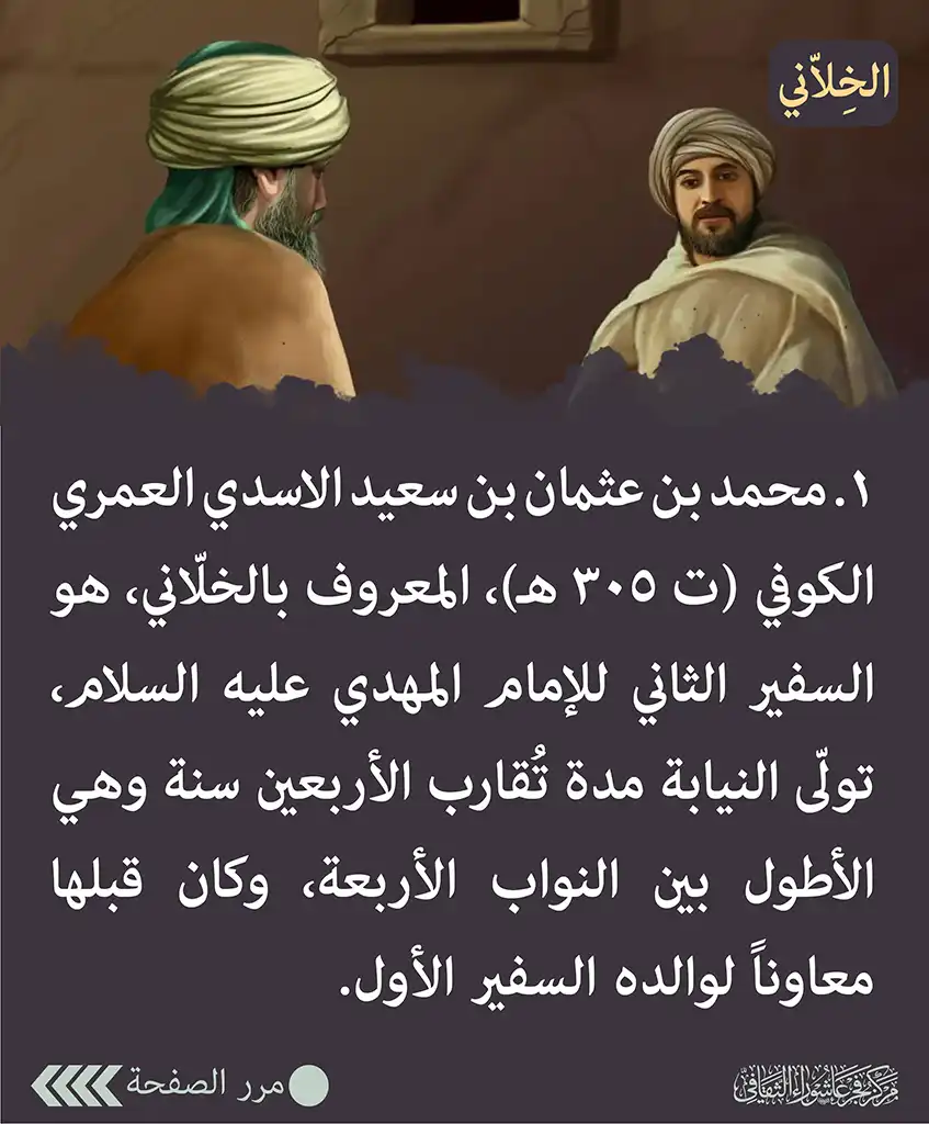 - محمد بن عثمان بن سعيد الاسدي العمري الكوفي (ت 305 هـ)، المعروف بالخلّاني، هو السفير الثاني للإمام المهدي عليه السلام، تولّى النيابة مدة تُقارب الأربعين سنة وهي الأطول بين النواب الأربعة، وكان قبلها معاوناً لوالده السفير الأول.