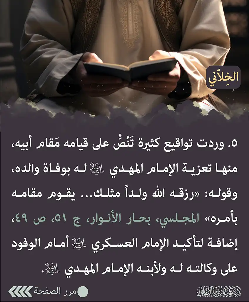 - وردت تواقيع كثيرة تنص على قيامه مقام أبيه، منها تعزية الإمام المهدي عليه السلام له بوفاة والده، وقوله: «رزقه الله ولداً مثلك… يقوم مقامه بأمره» (المجلسي، بحار الأنوار، ج 51، ص 349)، إضافة لتأكيد الإمام العسكري عليه السلام أمام الوفود على وكالته له ولأبنه الإمام المهدي (ع).