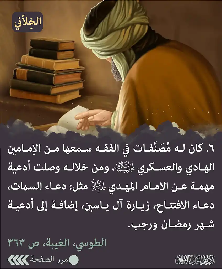 - كان له مُصَنَّفات في الفقه سمعها من الإمامين الهادي والعسكري عليهما السلام، ومن خلاله وصلت أدعية مهمة عن الامام المهدي (ع) مثل: دعاء السمات، دعاء الافتتاح، زيارة آل ياسين، إضافة إلى أدعية شهر رمضان ورجب. (الطوسي، الغيبة، ص 363).