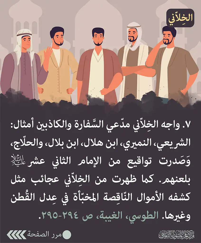 - واجه الخِلاّني مدّعي السَّفارة والكاذبين أمثال: الشريعي، النميري، ابن هلال، ابن بلال، والحلّاج، وصدرت تواقيع من الإمام الثاني عشر (ع) بلعنهم. كما ظهرت من الخِلاّني عجائب مثل كشفه الأموال النّاقِصة المخبّأة في عِدل القُطن وغيرها. الطوسي، الغيبة، ص 294-295.