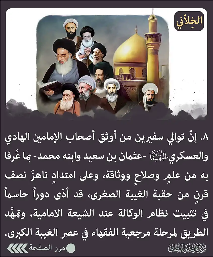 - إنّ توالي سفيرين من أوثق أصحاب الإمامين الهادي والعسكري (عليهما السلام) -عثمان بن سعيد وابنه محمد- بما عُرفا به من علمٍ وصلاحٍ ووثاقة، وعلى امتدادٍ ناهزَ نصف قرنٍ من حقبة الغيبة الصغرى، قد أدّى دوراً حاسماً في تثبيت نظام الوكالة عند الشيعة الامامية، وتمهَّد الطريق لمرحلة مرجعية الفقهاء في عصر الغيبة الكبرى.