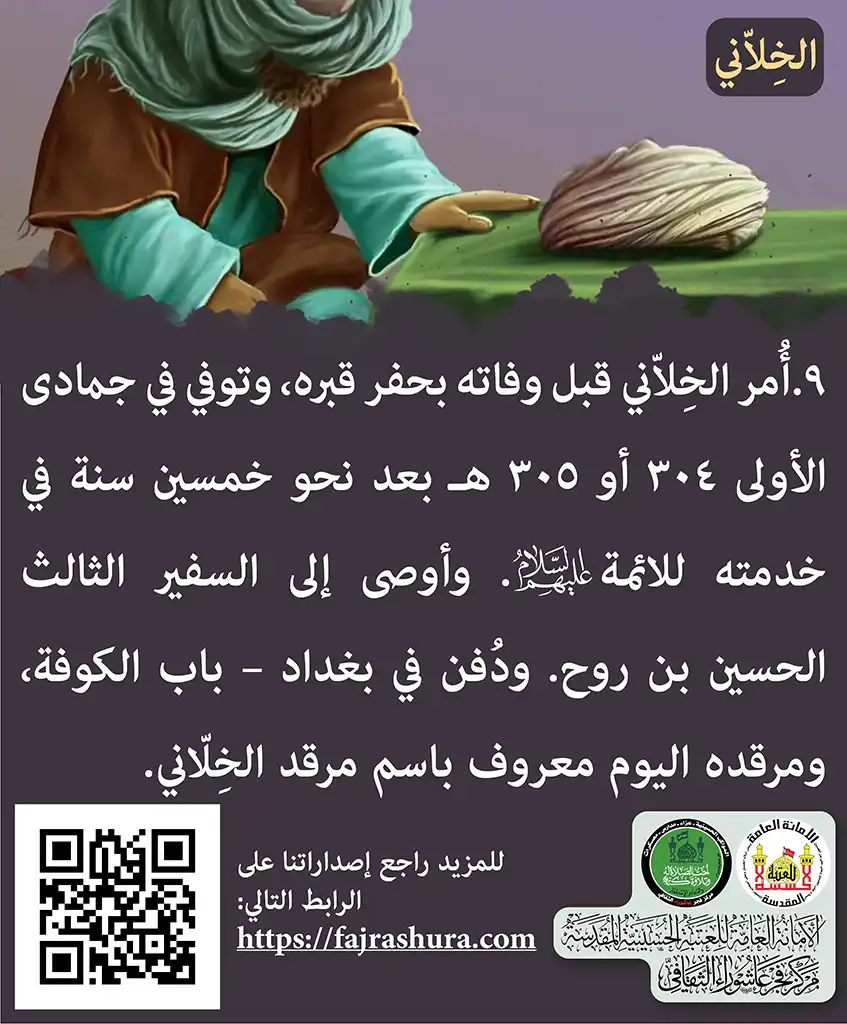 - أُمر الخِلاّني قبل وفاته بحفر قبره، وتوفي في جمادى الأولى 304 أو 305 هـ بعد نحو خمسين سنة في خدمته للائمة (عليهم السلام). وأوصى إلى السفير الثالث الحسين بن روح. ودُفن في بغداد – باب الكوفة، ومرقده اليوم معروف باسم مرقد الخِلّاني.