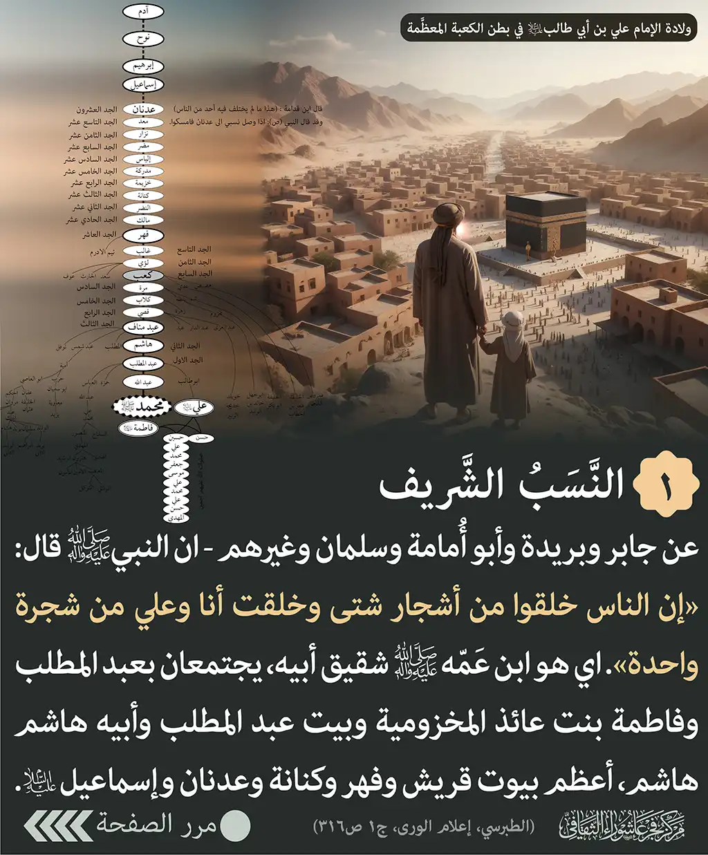 النَّسَبُ الشَّريف: عن جابر وبريدة وأبو أُمامة وسلمان وغيرهم – ان النبي(ص) قال: «إن الناس خلقوا من أشجار شتى وخلقت أنا وعلي من شجرة واحدة». اي هو ابن عَمّه (ص) شقيق أبيه، يجتمعان بعبد المطلب وفاطمة بنت عائذ المخزومية وبيت عبد المطلب وأبيه هاشم هاشم، أعظم بيوت قريش وفهر وكنانة وعدنان وإسماعيل (ع). (الطبرسي، إعلام الورى، ج1 ص316)
