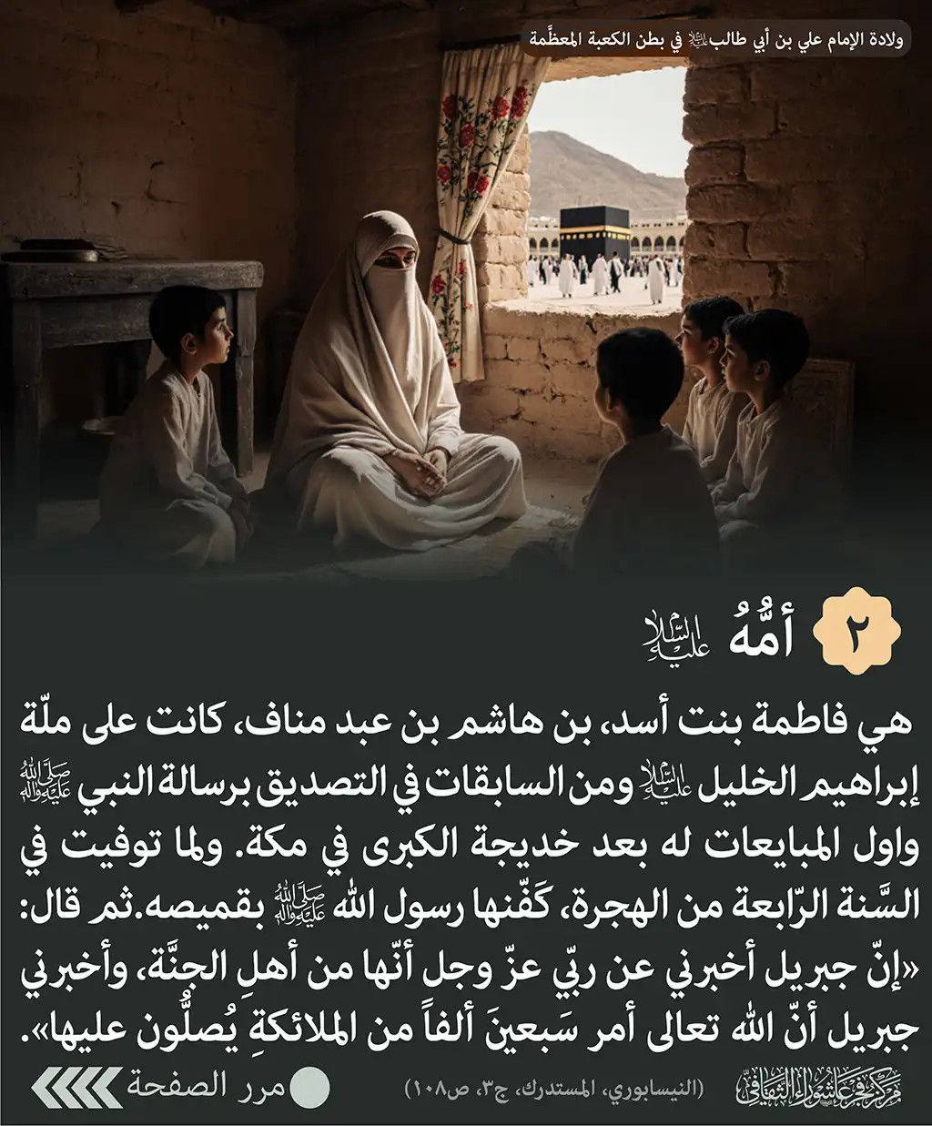 قال: فوقفت بإزاء البيت الحرام، وقد أخذها الطلق، فرمت بطرفها نحو السماء …