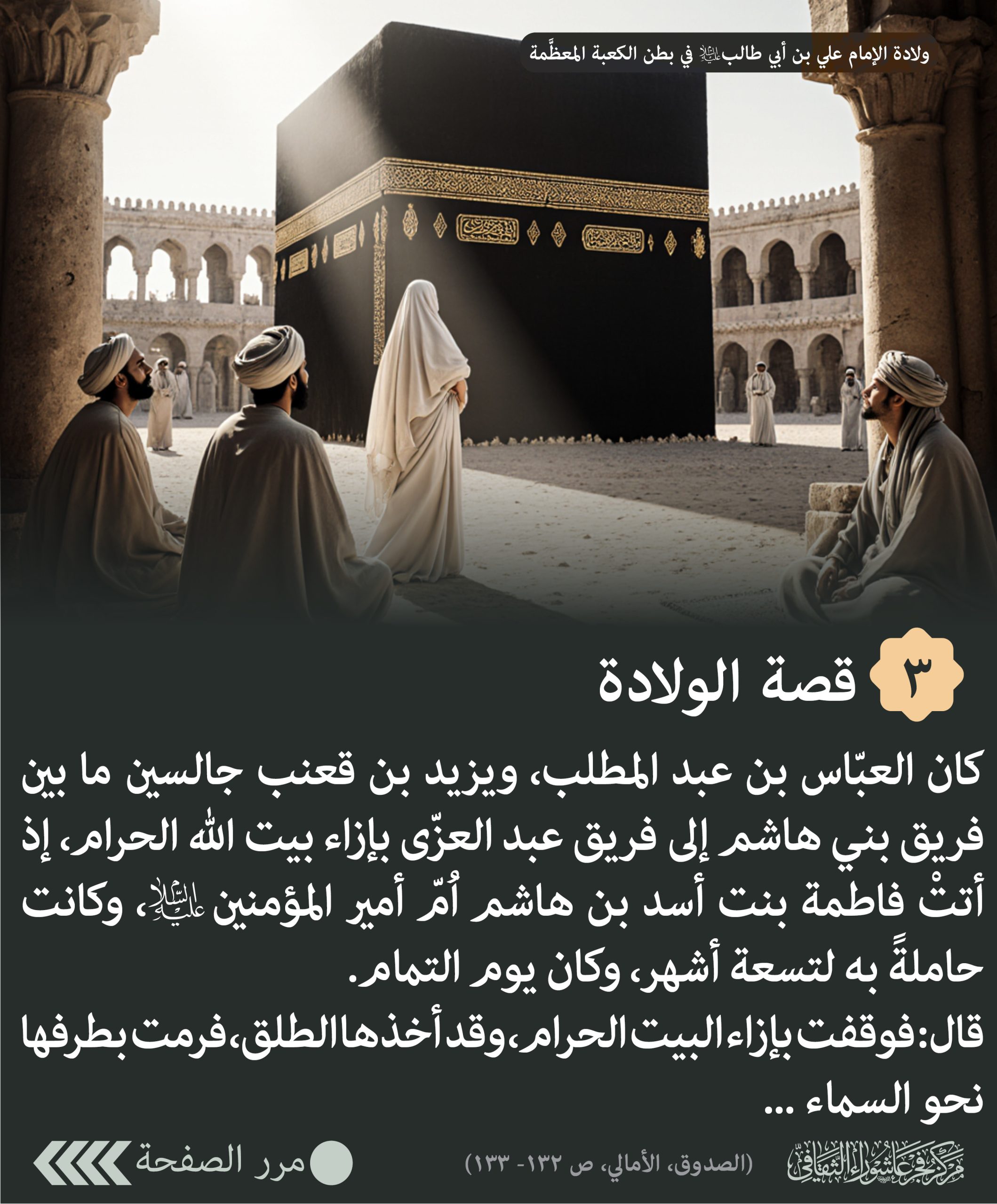 قصة الولادة: كان العبّاس بن عبد المطلب، ويزيد بن قعنب جالسين ما بين فريق بني هاشم إلى فريق عبد العزّى بإزاء بيت الله الحرام، إذ أتتْ فاطمة بنت أسد بن هاشم اُمّ أمير المؤمنين (ع)، وكانت حاملةً به لتسعة أشهر، وكان يوم التمام.