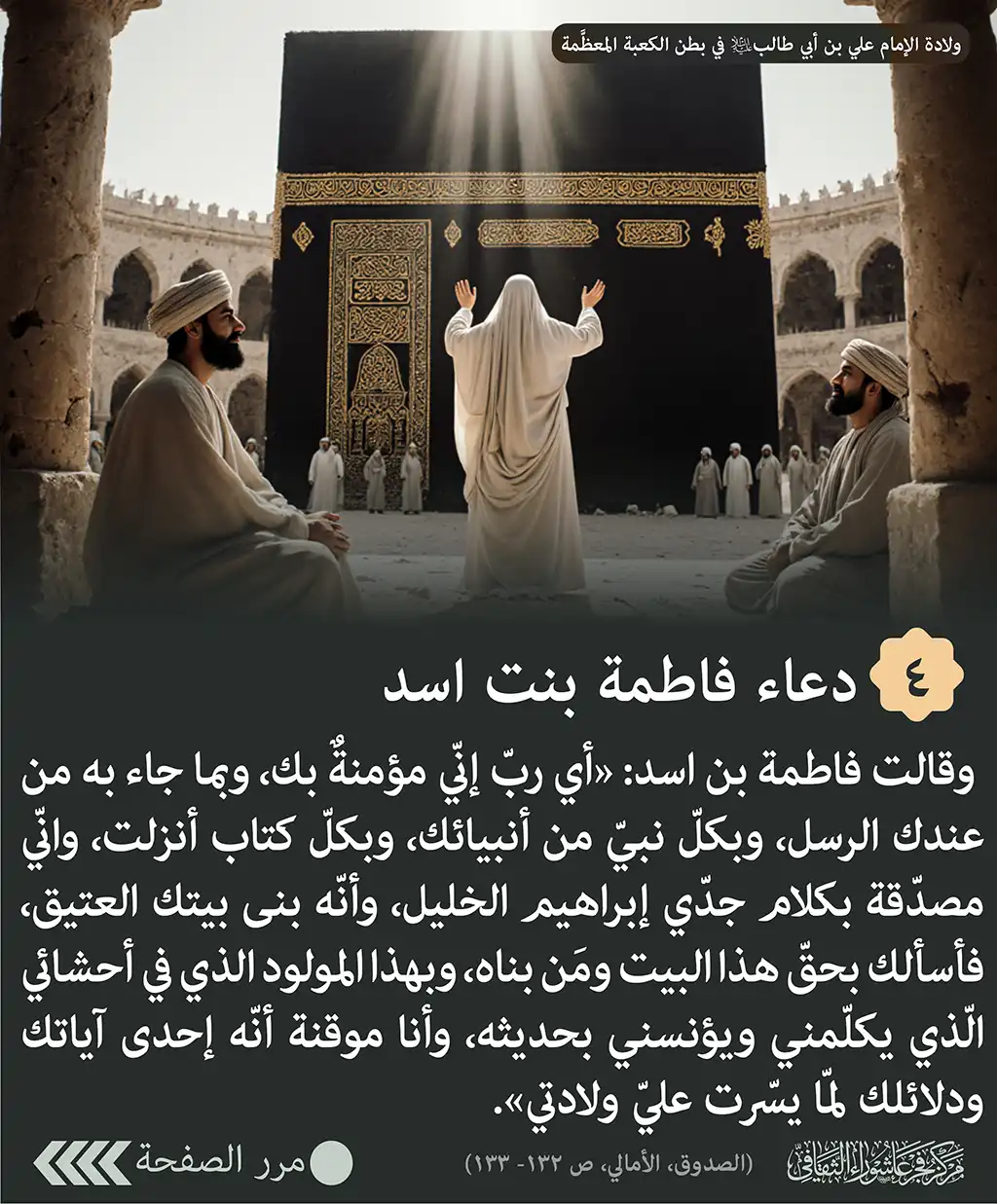 دعاء فاطمة بنت اسد: وقالت فاطمة بن اسد: «أي ربّ إنّي مؤمنةٌ بك، وبما جاء به من عندك الرسل، وبكلّ نبيّ من أنبيائك، وبكلّ كتاب أنزلت، وانّي مصدّقة بكلام جدّي إبراهيم الخليل، وأنّه بنى بيتك العتيق، فأسألك بحقّ هذا البيت ومَن بناه، وبهذا المولود الذي في أحشائي الّذي يكلّمني ويؤنسني بحديثه، وأنا موقنة أنّه إحدى آياتك ودلائلك لمّا يسّرت عليّ ولادتي».