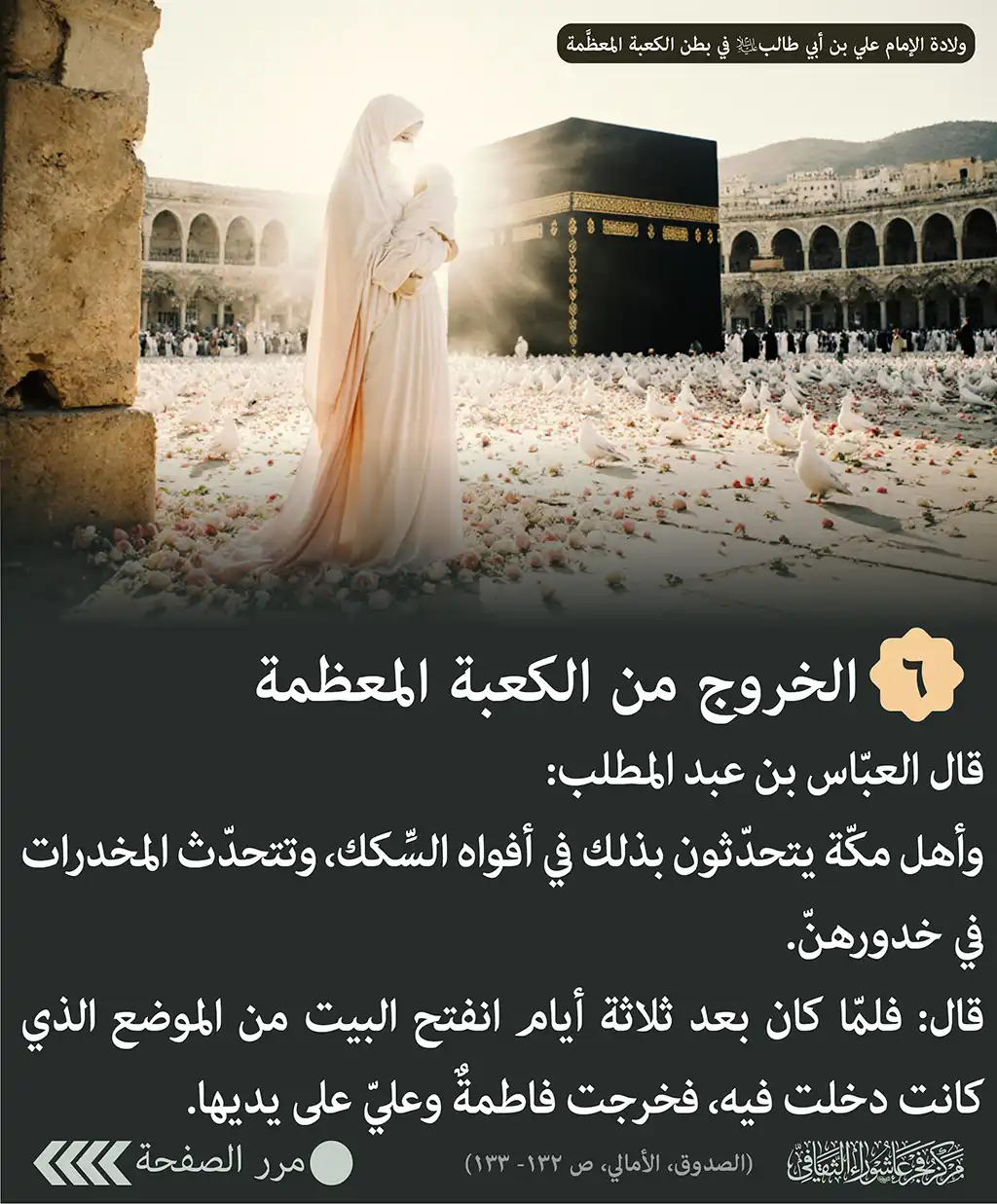 الخروج من الكعبة المعظمة: قال العبّاس بن عبد المطلب: وأهل مكّة يتحدّثون بذلك في أفواه السِّكك، وتتحدّث المخدرات في خدورهنّ. قال: فلمّا كان بعد ثلاثة أيام انفتح البيت من الموضع الذي كانت دخلت فيه، فخرجت فاطمةٌ وعليّ على يديها. (الصدوق، الأمالي، ص 132- 133)