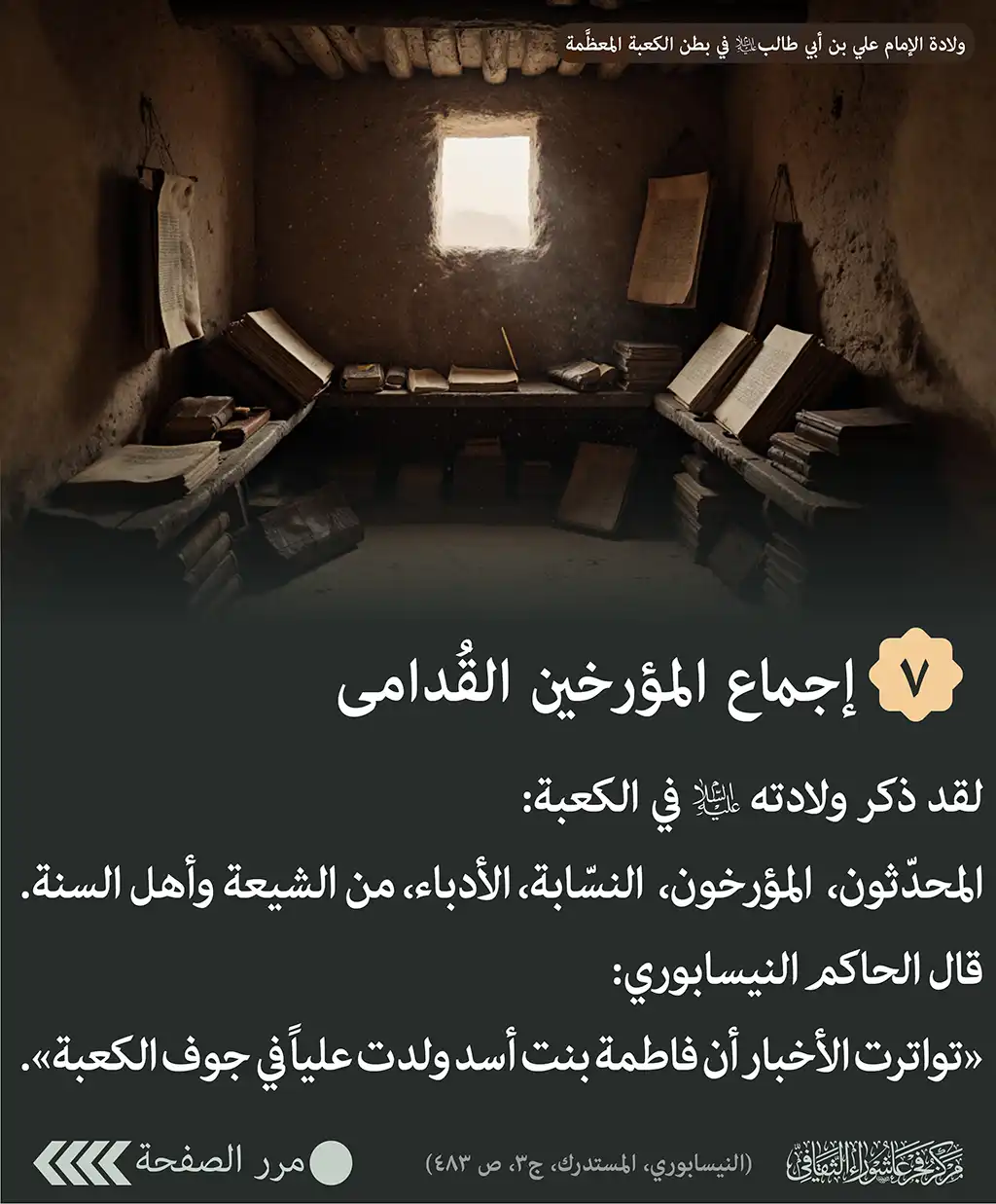 إجماع المؤرخين القُدامى – لقد ذكر ولادته (ع) في الكعبة: المحدّثون، المؤرخون، النسّابة، الأدباء، من الشيعة وأهل السنة. قال الحاكم النيسابوري: «تواترت الأخبار أن فاطمة بنت أسد ولدت علياً في جوف الكعبة». (النيسابوري، المستدرك، ج3، ص 483)