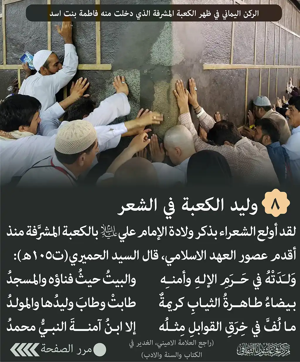 وليد الكعبة في الشعر- لقد أولع الشعراء بذكر ولادة الإمام علي(ع) بالكعبة المشرَّفة منذ أقدم عصور العهد الاسلامي، قال السيد الحميري(ت105ه):