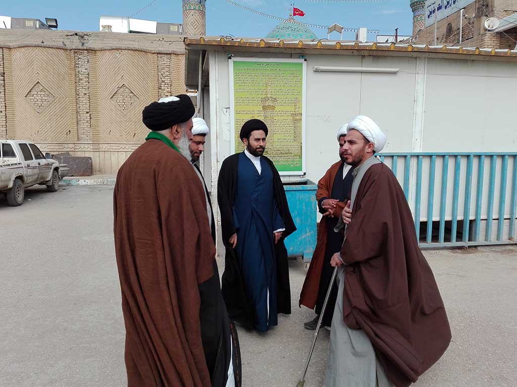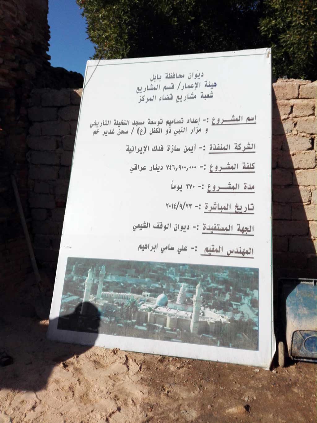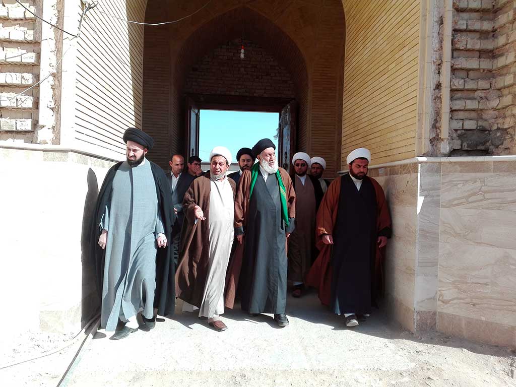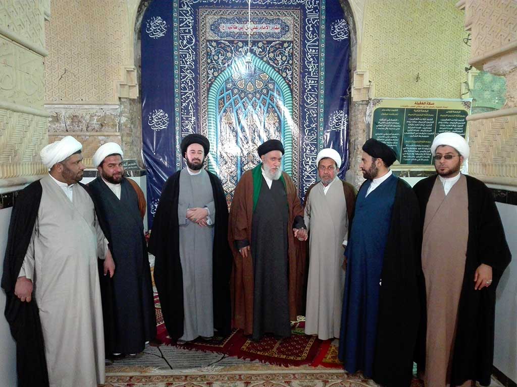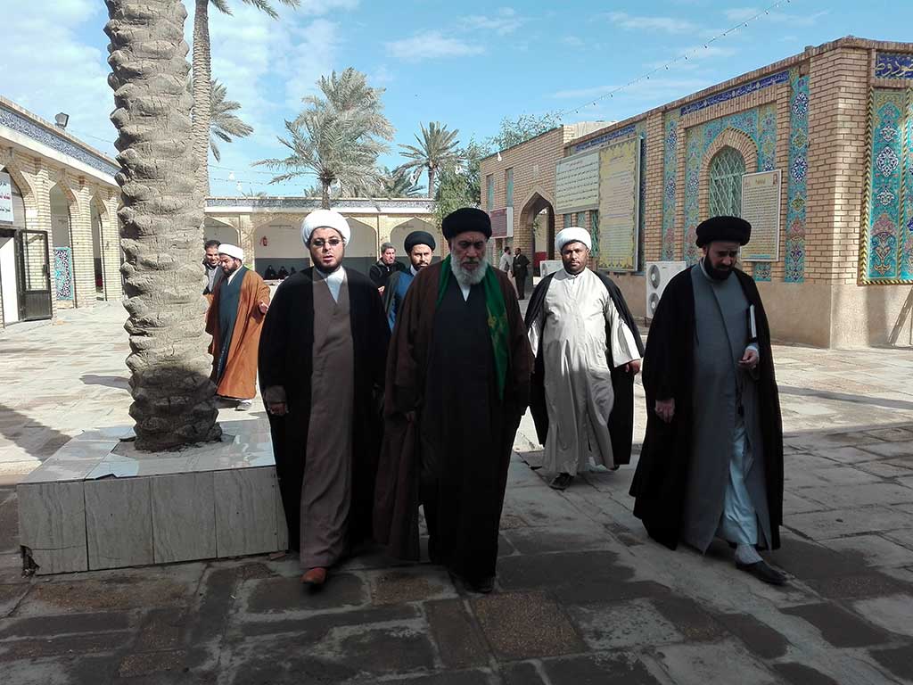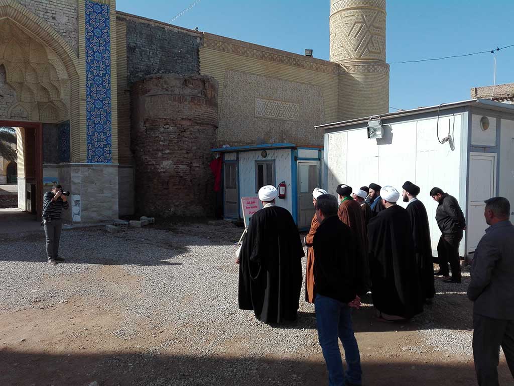 توجه سماحة السيد البدري والوفد المرافق له لزيارة مسجد النخيلة التاريخي ومرقد نبي الله ذي الكفل وكان في استقباله عند باب المسجد الامين الخاص للمزار سماحة الشيخ (رزاق المسلماوي) وقام سماحة الشيخ ببيان اهم المعالم الموجودة في المسجد من المأذنة التاريخية الى مقام امير المؤمنين (ع) حيث طلب السيد البدري اداء الصلاة في مكان المحراب حيث صلى امير المؤمنين (ع).