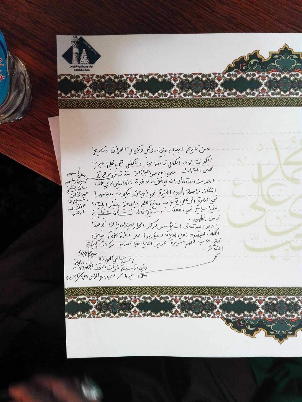 ثم ختمت الزيارة بدعوة كريمة من الشيخ قاسم الحسناوي الى وجبة غداء في بيته بحضور بعض طلبة العلوم الدينية من مدينة الكفل ودار الحديث حول بطولات الحشد الشعبي والقصص الكثيرة التي صادفتهم.